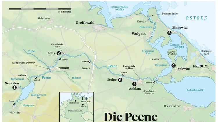 Frei schlängelt sich die Peene von Neukalen bis zur Mündung in den Peenestrom bei Anklam. Ein Törn der Gegensätze führt auf einem der ursprünglichsten Flüsse Deutschlands und weiter bis zur beliebten Urlaubsinsel Usedom.