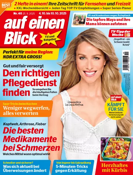 2 Hefte in einem: Die große Programmzeitschrift und Freizeit-Illustrierte 2 Hefte in einem: Ihre Zeitschrift für Fernsehen und Freizeit. Die auf einen Blick ist die große, wöchentliche Fernseh- und Freizeitillustrierte mit vollständigem Fernsehprogramm. Im Abo erhalten Sie mit jedem Heft beste Gesundheitstipps, spannende Reportagen und leckere Rezepte. auf einen Blick bietet Woche für Woche alle wichtigen Informationen zum Fernsehprogramm und einen umfangreichen Ratgeber-Teil. Die Zeitschrift ist eine lesenswerte Mischung mit packenden Schicksalsreportagen, viel Unterhaltung und jeder Menge nützlicher Tipps zu den Themen Gesundheit, Geld, Recht und vielem mehr. Eben der perfekte Mix aus Programmzeitschrift und Freizeitillustrierte – im Abo immer pünktlich im Briefkasten. Lassen Sie sich von auf einen Blick unterhalten, entdecken Sie jede Woche neue herausfordernde Rätsel und bleiben Sie immer auf dem Laufenden zu Ihren TV-Stars! Für die Fernsehfreundin, die zwei Hefte auf einmal will: TV-Ratgeber und Freizeit-Illustrierte. Inhalt: Übersichtlicher Programmteil mit viel Platz für die wichtigen Sender, Hörfunk, aktuelle Reportagen und Schicksale, Ratgeber, Gesundheit, Mode, Rätsel und vieles mehr.