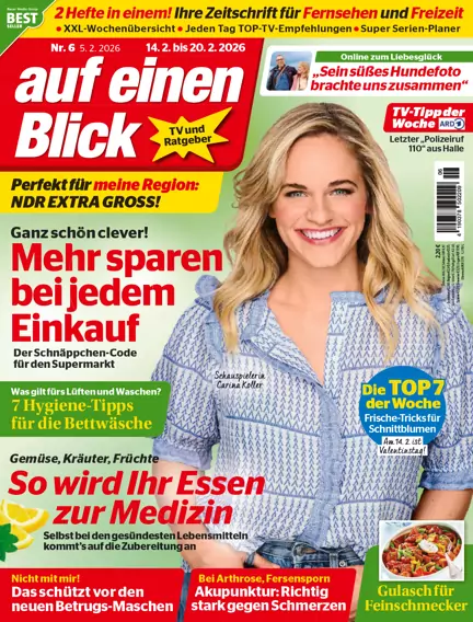 2 Hefte in einem: Die große Programmzeitschrift und Freizeit-Illustrierte 2 Hefte in einem: Ihre Zeitschrift für Fernsehen und Freizeit. Die auf einen Blick ist die große, wöchentliche Fernseh- und Freizeitillustrierte mit vollständigem Fernsehprogramm. Im Abo erhalten Sie mit jedem Heft beste Gesundheitstipps, spannende Reportagen und leckere Rezepte. auf einen Blick bietet Woche für Woche alle wichtigen Informationen zum Fernsehprogramm und einen umfangreichen Ratgeber-Teil. Die Zeitschrift ist eine lesenswerte Mischung mit packenden Schicksalsreportagen, viel Unterhaltung und jeder Menge nützlicher Tipps zu den Themen Gesundheit, Geld, Recht und vielem mehr. Eben der perfekte Mix aus Programmzeitschrift und Freizeitillustrierte – im Abo immer pünktlich im Briefkasten. Lassen Sie sich von auf einen Blick unterhalten, entdecken Sie jede Woche neue herausfordernde Rätsel und bleiben Sie immer auf dem Laufenden zu Ihren TV-Stars! Für die Fernsehfreundin, die zwei Hefte auf einmal will: TV-Ratgeber und Freizeit-Illustrierte. Inhalt: Übersichtlicher Programmteil mit viel Platz für die wichtigen Sender, Hörfunk, aktuelle Reportagen und Schicksale, Ratgeber, Gesundheit, Mode, Rätsel und vieles mehr.