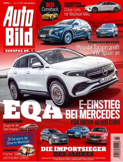 Jeden Donnerstag in AUTO BILD: mal hart am Blech mit Test- und Technikbeiträgen, mal über die Stoßstangen hinaus mit umfangreichen Servicethemen. Große Neu- und Gebrauchtwagenvergleiche, Werkstatt- und Reifentests, aktuelle Nachrichten und Lesertipps, aber auch Reiseinfos und Versicherungsthemen sind wichtige Teile des redaktionellen Konzepts.