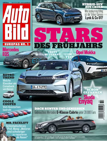 Jeden Donnerstag in AUTO BILD: mal hart am Blech mit Test- und Technikbeiträgen, mal über die Stoßstangen hinaus mit umfangreichen Servicethemen. Große Neu- und Gebrauchtwagenvergleiche, Werkstatt- und Reifentests, aktuelle Nachrichten und Lesertipps, aber auch Reiseinfos und Versicherungsthemen sind wichtige Teile des redaktionellen Konzepts.