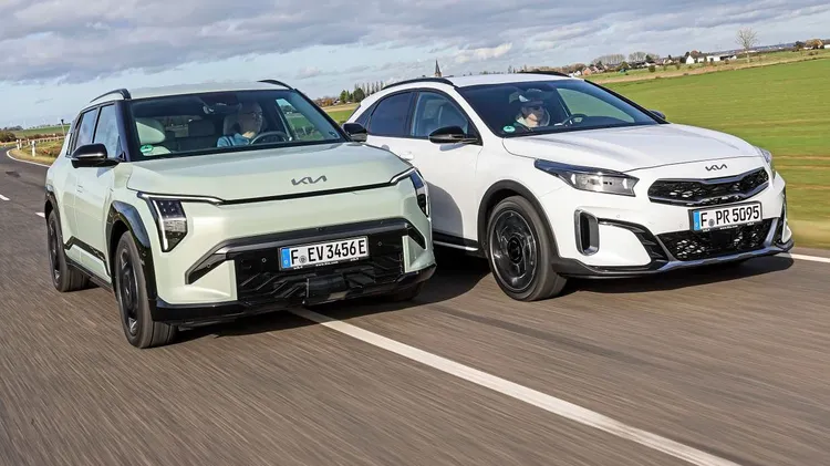 Irgendwo zwischen Kompaktwagen und SUV buhlen diese beiden Kia um Käufer – der weiße XCeed ganz konventionell, der EV3 vollelektrisch
