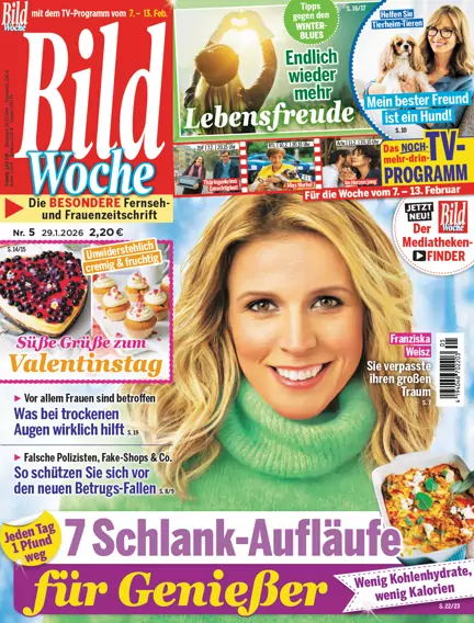 3 in 1 ! TV, Rätsel & Freizeit „Mehr Rat – Mehr Tat – Mehr Tipps für jeden Tag“ Dieser Claim steht für das neue Konzept der Bild Woche. Der Mantel garantiert zum einen hohen Nutzwert durch ausführliche Ratgeber mit Tipps und Informationen zu allen Bereichen des täglichen Lebens, zum anderen mitreißende Unterhaltung durch "Geschichten, die das Leben schreibt“, die auch immer mit einem Experten-Rat verbunden werden. Im TV-Programm erweitert die Bild Woche ihre redaktionelle Leistung. Zusätzlich zum liebgewonnenen Programm präsentiert die BildWoche an den sieben Tagen über 120 Tipps in einer besonderen Leiste. Doch diese sind keine klassischen Sendungshinweise, sondern spannende Hintergrund-Informationen zu den Stars, fundierte Service-Tipps als Ergänzung oder kleine Spaß-Elemente für die TV-Pause. Damit hat BildWoche einen einzigartigen USP in Mantel und Programm im Markt der wöchentlichen Programmzeitschriften.