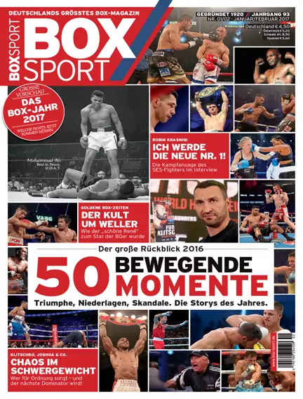 Großartige Siege, bittere Pleiten, Skandale und enttäuschende Kampfabsagen: Im Jahres-Rückblick lässt BOXSPORT das Jahr 2016 noch einmal Revue passieren. Doch die Ausgabe schaut auch auf 2017 voraus – vor allem auf die spannende Lage im Schwergewicht, wo Wladimir Klitschko seine Titel zurück will. Über die Zukunft spricht auch Robin Krasnqi, der nicht nur zu den Hoffnungsträgern zählt, sondern gegen Arthur Abraham einen WM-Eleminator-Kampf bestreiten soll. Dazu liefert die Ausgabe jede Menge Storys aus dem internationalen Boxen, Ranglisten, Kampfreports und vieles mehr.