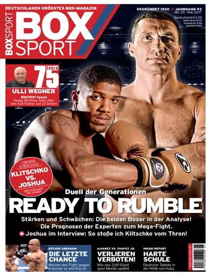 In der aktuellen BOXSPORT steht das Top-Event zwischen Champion Anthony Joshua und Wladimir Klitschko im Vordergrund und wird von allen Seiten beleuchtet: mit einer sportlichen Analyse zu den beiden Fightern, einem Interview mit Jungstar Anthony Joshua sowie Experten-Meinungen zum Ausgang des Kampfes. Außerdem schließt eine Story zu den größten Stadionkämpfen der Neuzeit an das Mega-Duell in London an. Das SPEZIAL ist Ulli Wegner gewidmet, der am 26. April 75 Jahre alt wird. Der erfolgreichste und beliebteste deutsche Proficoach feiert damit ein großes Jubiläum. Deshalb blickt BOXSPORT auf seine sportliche Karriere und das Leben des Kult-Trainers. Neben Wegner selbst kommen natürlich auch Weggefährten und Experten zu Wort.