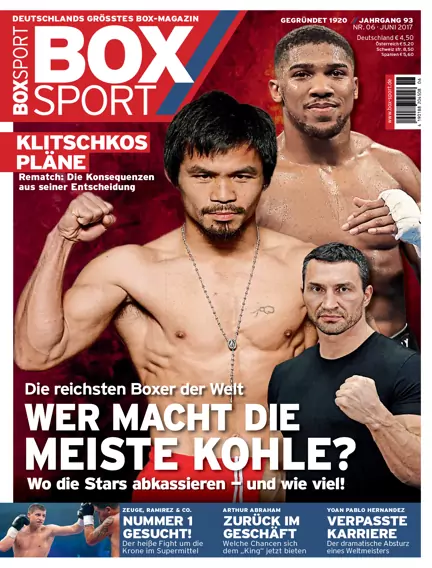 Wer sind die Kohle-Kings im Profiboxen? BOXSPORT listet in seiner aktuellen Ausgabe die Top 10 der reichsten aktiven Boxer. Und verrät, wie ihr Vermögen zustande kommt. Außerdem: Zwischen Rückkampf und Rücktritt – welche Konsequenzen Klitschkos Entscheidung nach der Schlacht von Wembley hat. Weiteres Highlight: Wie nah Arthur Abraham an seinem Ziel WM-Kampf wirklich dran ist. Plus: die große Analyse zur spannenden Situation im Supermittelgewicht. Dazu jede Menge internationale Top-Themen, Ranglisten, Olympisches Boxen und vieles mehr.