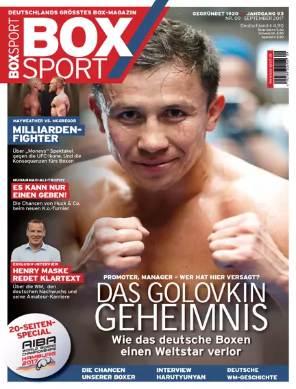 Die Ausgabe liefert ein 20-Seiten-Special zur AIBA Box-WM in Hamburg mit Storys, Analysen, Fakten plus Einschätzung: So stehen die Medaillenchancen der deutschen Boxer. Dazu gibt es ein exklusives Interview mit Box-Idol Henry Maske. Im Blickpunkt: die Story von Weltstar Gennady Golovkin – wie das deutsche Boxen eine große Chance verpasste. Außerdem beleuchtet das Heft die World Boxing Super Series: Das sind die Kämpfer und Fights der neuen „Champions League“ des Boxens. Plus: alles zum Mega-Spektakel Mayweather vs. McGregor und vieles mehr.