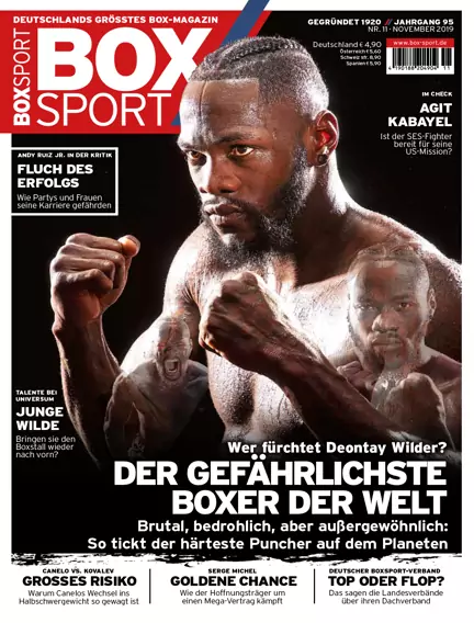 Der gefährlichste Boxer der Welt! Deontay Wilder ist seit fast fünf Jahren WBC-Weltmeister im Schwergewicht. Mit seiner brutalen K.o.-Power entwickelte er sich in den vergangenen Monaten mehr und mehr zum potenziellen Herrscher der Königsklasse. BOXSPORT erklärt das Phänomen „Bronze Bomber“. Außerdem: Die große Umfrage im olympischen Boxen. Wie zufrieden sind die Landesverbände mit dem DBV? Dazu: SES-Schwergewichtler Agit Kabayel im BOXSPORT-Check. Und: Michael Buffer wird 75! Alles zum Leben und zur Karriere der „Stimme des Boxens“. Plus jede Menge Storys, Analysen, Ranglisten, Kampfreports und vieles mehr.