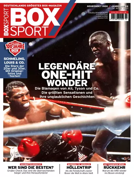 Vor 30 Jahren besiegte James „Buster“ Douglas als krasser Außenseiter Champion Mike Tyson – und blieb ein Held für einen einzigen Kampf. Passend dazu listet BOXSPORT die zehn größten One-Hit-Wonder der Boxgeschichte. Außerdem: großes Interview mit Promoter-Legende Wilfried Sauerland, der 80 Jahre alt wurde. Dazu liefert BOXSPORT als Wichtige zum nächsten WM-Fight von Dominic Bösel und dem Box-Comeback der ARD. Und: Halbmittelgewicht – eine Analyse der Champs und ihrer Herausforderer. Plus jede Menge Storys, Analysen, Ranglisten, Kampfreports und vieles mehr.