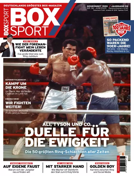 Die besten Kämpfe aller Zeiten! BOXSPORT listet die 50 legendärsten Ringschlachten mit Größen wie Muhammad Ali, Mike Tyson und Co. im ultimativen Ranking. Plus: Das sagen die Experten! Außerdem: Was macht Vincent Feigenbutz nach der Trennung von seinem Manager und wie kam es dazu? Dazu: 20 Jahre SES Boxing – alles zum großen Jubiläum des Magdeburger Stalls. Und: BOXSPORT erklärt, warum Top-Talent Ryan Garcia in den USA den Status eines Popstars hat. Plus jede Menge Storys, Analysen, Ranglisten und vieles mehr.