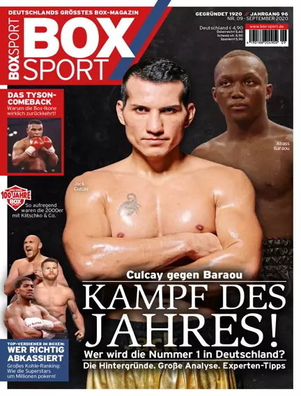 Der deutsche Fight des Jahres! BOXSPORT liefert alle Infos zum Mega-Duell von Jack Culcay und Abass Baraou. Plus: Vincent Feigenbutz gibt sein Mittelgewichtsdebüt gegen Jama Saidi! Außerdem: Wer macht aktuell die meiste Kohle im Boxen? Die zehn profitabelsten Boxer im Ranking. Dazu: Mike Tyson gegen Roy Jones jr. – BOXSPORT klärt die wichtigsten Fragen zum Comeback-Fight. Und: Karriereanfänge – wie begannen Ali, Canelo und Co. mit dem Boxen? Plus jede Menge Storys, Analysen, Ranglisten, Kampfreports und vieles mehr.