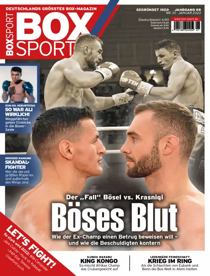 Großer Zoff im Box-Geschäft. Robin Krasniqi will beweisen, dass er im Bösel-Rematch betrogen wurde, die Gegenseite kontert. Plus: Exklusiv-Interview mit Robin Krasniqi. Außerdem: 80 Jahre Muhammad Ali. Ein Rückblick mit Zeitzeugen zum runden Geburtstag der verstorbenen Legende. Dazu: Deutsches Mega-Duell im Schwergewicht. Wie die Chancen beim Fight Agit Kabayel vs. Marco Huck verteilt sind. Und: Angriff auf den Thron. Mit welcher Strategie Terence Crawford Pound-for-Pound-King werden kann. Plus jede Menge Storys, Analysen, Ranglisten, Kampfreports und vieles mehr.