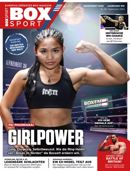 Fai Phannarai: „The Diamond“ im Interview über sportliche Ziele, Prügeleien auf dem Schulhof und Kindertage in Thailand. Außerdem: Nina Meinke – „The Brave“ hat endlich ihren WM-Fight und kann Box-Geschichte schreiben. Dazu: Boxen in der Schweiz – Ramadan Hiseni im Porträt. Und: Pound-for-Pound – Shields, Taylor, Cameron & Co.: Premiere für die neue BOXSPORT-P4P-Liste der starken Frauen! Plus jede Menge Storys, Analysen, Ranglisten, Kampfreports und vieles mehr.