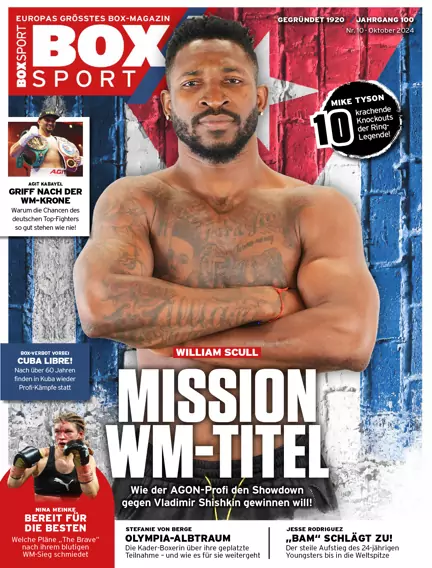 William Scull: Wie AGON-Fighter William Scull endlich zum langersehnten WM-Kampf kam. Außerdem: Nina Meinkes historischer WM-Triumph – So soll es für die neue IBF-Championesse im Federgewicht nun weitergehen. Dazu: Boxen in Kuba – Nach jahrzehntelangem Profi-Verbot: So verändert sich die Box-Szene im Karibikstaat. Und: Kathy Duva – Die Chefin von „Main Events“ mischt auch mit 71 Jahren voll im Box-Business mit. Plus jede Menge Storys, Analysen, Ranglisten, Kampfreports und vieles mehr.