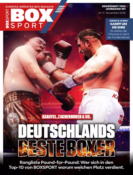 Kabayel, Eifert & Co.: Wie sieht aktuell die Top 10 der besten deutschen Boxer aus? BS stellt das ultimative Ranking Pound-for-Pound zusammen. Außerdem: Nach nur zwölf Profi-Fights ist AGON-Boxer Hamsat Shadalov bereits in Europas Elite angekommen. BS erzählt die Story des „Chechen Borz“. Dazu: Am 15. November steigt das Rematch zwischen Chris Eubank jr. und Conor Benn. So stehen die Chancen für die Rivalen. Und: Stützpunktreform beim DBV – Das ist das neue Trainingszentrum in Heidelberg. Plus jede Menge Storys, Analysen, Ranglisten, Kampfreports und vieles mehr.