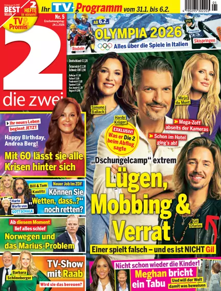 Die 2 – der Name ist Programm, denn die 2 steht für die in Deutschland einmalige Kombination von Stars und TV-Programm. Die 2 berichtet von den Lieblingen des Fernsehens, den Promis aus Show-Biz und Gesellschaft und den royalen Mitgliedern weltweit. Die 2 hat das aktuellste Programm aller TV Titel Deutschlands und präsentiert dies für über 40 Sender. Abgerundet wird dieses Paket an Informationen mit Service-Elementen zu Gesundheit, Reise, Beauty und Food.