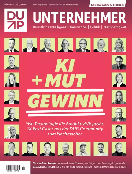 ÜBER DUP UNTERNEHMER-MAGAZIN Das DUP UNTERNEHMER-Magazin – herausgegeben von der ehemaligen Bundeswirtschaftsministerin Brigitte Zypries – ist das Leitmedium für Innovation, Künstliche Intelligenz und Nachhaltigkeit. Alle zwei Monate erscheint das Heft am Kiosk sowie als Beilage in den Entscheidermedien „Süddeutsche Zeitung“ und „Frankfurter Allgemeine Sonntagszeitung“. Einzigartig ist der Mix aus Digitalisierungs-, Nachhaltigkeits-, Leadership-, Finanz-, Unternehmensnachfolge- und Lifestyle-Themen.
