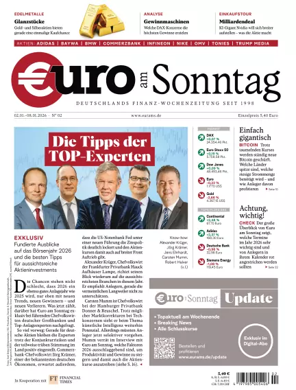 €uro am Sonntag ist eine wöchentlich erscheinende Wirtschafts- und Finanzzeitung. Jede Woche analysiert €uro am Sonntag neu die Entwicklungen an den Kapitalmärkten und vermittelt unabhängige und nachhaltige Informationen für eine erfolgreiche Investmentstrategie. Mit dem Readly ePaper Abo verpassen Sie nie wieder eine Ausgabe der €uro am Sonntag.
