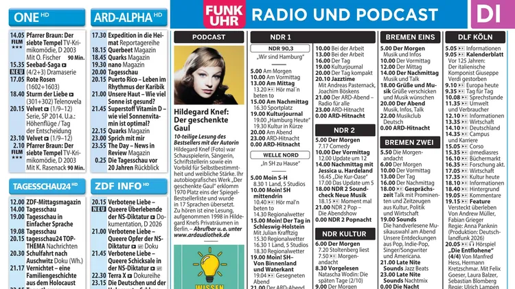 Mein Fernseh-Magazin! Rund um das ausführliche TV-Programm bietet der Mantelteil von FUNK UHR Schwerpunktthemen wie Gesundheit und Wellness, Hintergrundinformationen und aktuelle News zu Ernährung, Mode, Beauty, Partnerschaft und Familie, Tipps zu Geld, Recht und Haushalt. Außerdem Reportagen über besondere Menschen, Geschichten voller Emotionalität und jeden Monat ein Wunschthema. FUNK UHR ist wie eine Freundin. Sie zeigt der Leserin, dass sie sie kennt und vermittelt ihr das Gefühl, so ist es, genauso denke ich auch.