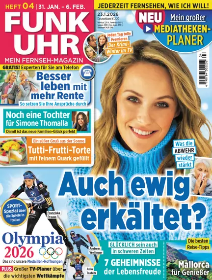 Mein Fernseh-Magazin! Rund um das ausführliche TV-Programm bietet der Mantelteil von FUNK UHR Schwerpunktthemen wie Gesundheit und Wellness, Hintergrundinformationen und aktuelle News zu Ernährung, Mode, Beauty, Partnerschaft und Familie, Tipps zu Geld, Recht und Haushalt. Außerdem Reportagen über besondere Menschen, Geschichten voller Emotionalität und jeden Monat ein Wunschthema. FUNK UHR ist wie eine Freundin. Sie zeigt der Leserin, dass sie sie kennt und vermittelt ihr das Gefühl, so ist es, genauso denke ich auch.