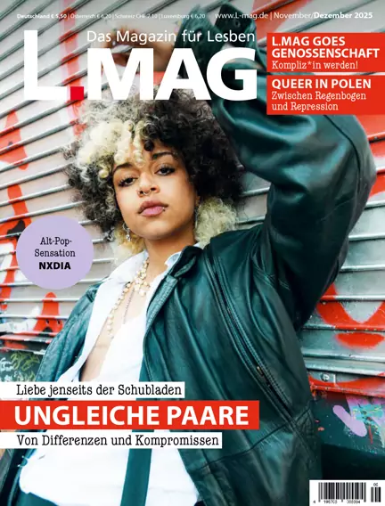 WIR SIND LESBISCH, FEMINISTISCH UND QUEER – UND DAS SCHON SEIT 2003 ! Aktuelle Ausgabe November/ Dezember 2025: Liebe jenseits von Schubladen L-MAG sprach mit Paaren, die ihre Unterschiedlichkeit feiern. Ob in den Lebensentwürfen, Hintergründen oder Temperamenten. Eine Titelstory von Age Gap über Schmetterlinge in Shanghai bis zum Butch-Femme Paar. Ein Gastbeitrag der EuroCentralAsian Lesbian* Community mit einem Plädoyer für eine radikale globale lesbische Bewegung und eine Bilanz der bisherigen Arbeit der schwarz-roten Koalition setzen im Heft politische Schwerpunkte. Außerdem im Heft: Sophie Koch, bundesweite Queerbeauftragte, in der L-Kampagne, Ausstellung Queer Gaze, die Heldin Radclyffe Hall, King Princess mit neuem Album und Schauspieldebüt, Aktivist:innen über die SIchtbarkeit der queeren Bewegung in Polen und Namibia Dazu gibt´s wie immer jede Menge News und Klatsch aus der Lesbenwelt, Film-, Serien-, Musik-, Ausstellungs- und Buchtipps und vieles mehr!