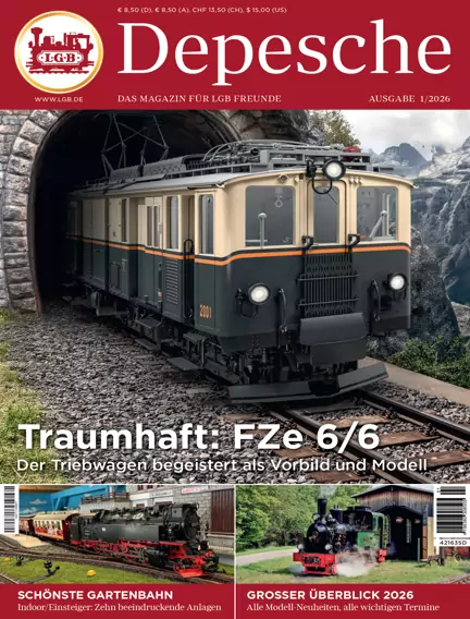 LGB Depesche - Das Magazin für LGB Freunde Mit einer Vielzahl von Anlagenbeispielen, detaillierten Bautipps und hochwertig produzierten Modellstories macht die LGB Depesche Lust auf die große Modellbahn und vermittelt Spielfreude pur. Als auflagenstarkes Magazin ist es Leitmedium für die Spur-G-Fahrer – outdoor wie indoor. # Damit Sie keine Ausgabe verpassen, gibt es ein Print-Abo und die Möglichkeit einer Clubmitgliedschaft, die weitere Vorteile bringt. Mehr unter www.lgb.de