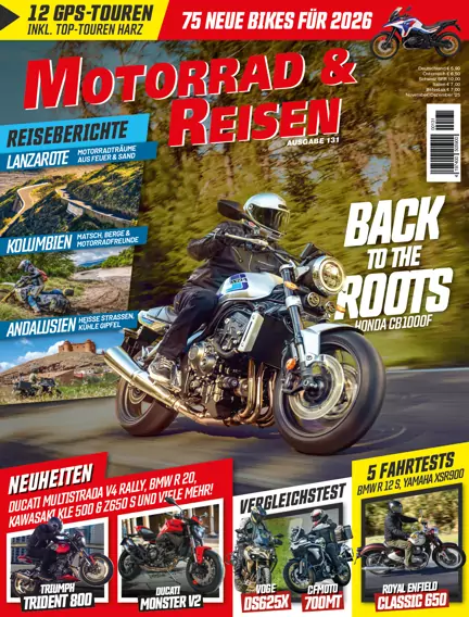 Fahrtests: BMW R 12 S, Royal Enfield Classic 650, CFMoto 700 MT, Voge DSX625X, Yamaha XSR900, CFMoto 700 MT vs. Voge DSX625X – Vergleichstest Motorräder: BMW: M 1300 GS, Brixton: Crossfire 500 Storr, Ducati: Diavel V4 RS, Multistrada V4 RS, Multistrada V4 Rally, Panigale V4 R, Monster V2, Scrambler Nightshift, Honda: WN7, CB1000F, Kawasaki: Z650 S, KLE 500, Z1100, Z1100 SE; KTM: 990 RC R, Norton: V4 Superbike, Suzuki: GSX-R1000R, e-VanVan, GSX-S1000, DR-Z4S+, Triumph: Bonneville Bobber, Bonneville Speedmaster, Scrambler 900, T100, T120, T120 Black, Scrambler 1200 XE, Trident 800 Touren/Reisen: Top 10 Motorradtouren: Harz, European Bike Week – Harley-Feeling am Faaker See, Kolumbien – Anden, Dschungel und Karibik, Andalusien – Der Ruf des Mulhacén, Lanzarote – Vulkane, Wind und Kamele Test: Modeka Brandon Cargo