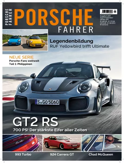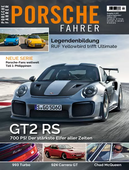 MADE BY PORSCHE Extremsport: 911 GT2 RS Biturbo-Aufladung, Heckmotor, Leistung bis zum Abwinken – das reicht, um den alle paar Jubeljahre aktualisierten 911 GT2 zu charakterisieren. Mit 700 PS und 340 km/h Spitze ist der neue GT2 RS der stärkste Elfer, den Porsche jemals auf die Straße gelassen hat. Ist das noch normal? MADE BY PORSCHE Die große Nummer: Eine Million 911 Eine Million Porsche 911. Da müsste man am Jubiläumstag ja einen treffen. Doch nix da, die Fahrt durch den Alltag findet an diesem Tag ohne Markenkollegen statt. Mein 911 bleibt allein. MADE BY PORSCHE Extremsport: 911 GT2 RS Biturbo-Aufladung, Heckmotor, Leistung bis zum Abwinken – das reicht, um den alle paar Jubeljahre aktualisierten 911 GT2 zu charakterisieren. Mit 700 PS und 340 km/h Spitze ist der neue GT2 RS der stärkste Elfer, den Porsche jemals auf die Straße gelassen hat. Ist das noch normal? MADE BY PORSCHE Die große Nummer: Eine Million 911 Eine Million Porsche 911. Da müsste man am Jubiläumstag ja einen treffen. Doch nix da, die Fahrt durch den Alltag findet an diesem Tag ohne Markenkollegen statt. Mein 911 bleibt allein. TITELSTORY Gelb zu Blau: RUF 911 Yellowbird und Ultimate Es gibt Dinge, die machen den Mittelpunkt einer Marke aus. Porsche ist ohne 911 undenkbar, zu RUF gehört der Yellowbird, firmenintern nüchtern CTR gerufen. Vor 30 Jahren kam er auf die Straße und begründete eine Serie von Hochleistungssportwagen. Seine Geschichte ist noch nicht zu Ende geschrieben. MENSCHEN "Porsche waren Familienmitglieder": Chad McQueen Chad McQueen war das erste Kind von Steve McQueen undblieb sein einziger Sohn. Von seinem Vater bekam er die Leidenschaft für schnelle Autos und Motorräder wohl in die Wiege gelegt. Mit neun Jahren fuhr er bereits Dirt-Track-Motorräder und wandte sich schnell den Autorennen zu – meistens fuhr er Porsche. Wen wundert's? MOTORSPORT Gemischte Gefühle: Le Mans 2017 Zweckoptimismus bei Porsche auf der Pressekonferenz am Freitag vor dem Start: „Wir wollen das Triple“, erklärt LMP-1-Chef Fritz Enzinger. Doch bei Porsche fühlt man sich nicht als Favorit, das ist in allen Gesprächen zu spüren. Die Hitze an diesen Tagen, der bisherige Saisonverlauf. Viele Zweifel. Und schließlich doch der Sieg. SPORT-SCHAU Ausnahme von der Regel: 928 S „Le Mans“ Wer träumte noch nicht davon, einmal am 24-h-Rennen von Le Mans teilzunehmen? Heutzutage wäre das eine Utopie, aber zu Beginn der achtziger Jahre war es durchaus möglich – vorausgesetzt, man glaubte fest daran. So wie Raymond Boutinaud, der als Einziger mit einem Porsche 928 in Le Mans antrat. FAHRTENBUCH 4 für die Vernunft: Macan WORKSHOP Herz & Verstand: Motor-Elektronik Die Probleme klassischer Porsche sind längst in der Neuzeit angekommen. Wenn Elektrik und Elektronik in die Jahre kommen, muss man sich Gedanken machen, wie man damit umgeht – zum Beispiel in einem PORSCHE FAHRER-Workshop. INVEST-TIPP Genug ist besser als zu viel: 911 2.7 REPORT Ernsthafte Absichten: 924 Carrera GT Mit dem Carrera GT adelte Porsche die Baureihe 924 mit einem großen Namen und verschob den Schwerpunkt der Baureihe erbarmungslos in Richtung Sport. Als erster Vertreter der Transaxle-Linie durfte der 924 Carrera GT exemplarisch aufzeigen, welch sportliches Potenzial in der Vierzylinder-Baureihe steckte. MAGAZIN Transformer: 911 2.0 Stuttgarter Designübung oder italienischer Alternativentwurf? Herkunft und Motivation des Einzelstücks auf Ur-Elfer-Basis bleiben vage, dramatisch ist sein Auftritt allemal. Eines der wenigen Rätsel im gründlich durchleuchteten Elfer-Kosmos wartet weiter auf seine finale Klärung. PORSCHE-FANS WELTWEIT Philippinen: Jay Aldeguer Die Porsche-Welt ist klein und groß zugleich. Die Begeisterung reicht um den ganzen Globus, Fans gibt es in jedem Land der Erde. PORSCHE FAHRER stellt sie vor. Teil 1. TUNING Überzeugungstäter: 911 SC RS Eigenbau Wie sähe der ideale Alltags-Elfer aus, wenn man alle anderen schon gefahren, repariert, besessen hat? John Esposito meint, er hätte mit seiner ganz eigenen Interpretation des Themas 911 SC RS die richtige Antwort gefunden. Es fällt schwer, dagegenzuhalten. HAPPY END Da geht noch was: 993 Turbo Er ist der erste serienmäßige Elfer mit Biturbo-Aufladung und Allradantrieb, der letzte mit Luftkühlung. Dem aufgeladenen 993 eilt der Ruf des Gesamtkunstwerks voraus, des perfekten klassischen 911 mit Aufladung.