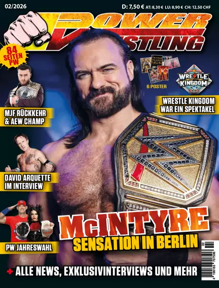 Die neue Ausgabe von Power-Wrestling bietet wieder eine prall gefüllte Mischung aus aktuellen Top-Themen, exklusiven Interviews, großen Rückblicken und spannenden Analysen. Im Mittelpunkt stehen diesmal der Titelgewinn von Drew McIntyre sowie die WWE-Deutschland-Tour, die wir mit zahlreichen Fotos und Hintergrundinfos begleiten. Dazu gibt es wie immer die heißesten News und Entwicklungen aus der Welt des Wrestlings. Bei NXT berichten wir ausführlich über die New-Years-Evil-Show und stellen mit Kendal Grey einen der spannendsten neuen Stars vor. WWE Geschichte und Rückblicke Auch historisch hat diese Ausgabe einiges zu bieten. In einem exklusiven Interview blickt Bushwhacker Luke auf seine Karriere zurück, während ein Retro-Quiz rund um Papa Shango nostalgische Erinnerungen weckt. Zudem beleuchten wir, wie und warum es bei WrestleMania IV zum legendären Zusammenschluss zwischen Hulk Hogan und dem „Macho Man“ Randy Savage kam. Der Royal Rumble 1992 wird ausführlich analysiert, ebenso wie in der Rubrik „Sag niemals nie“ gebrochene Rücktrittsankündigungen unter die Lupe genommen werden – inklusive eines Blicks auf John Cena. Ergänzt wird dieser Themenblock durch einen Rückblick auf die Wrestling-Karriere von David Arquette sowie ein Interview mit dem ehemaligen WCW-Champion und Schauspieler. AEW Der AEW-Teil ist ebenfalls umfangreich. Wir berichten ausführlich und reich bebildert über den AEW Worlds End Pay-per-View. In einem großen Porträt stellen wir Darby Allin vor, einen der spektakulärsten und kompromisslosesten Wrestler der Liga. Außerdem erinnern wir an den bewegenden Abschied von TNT-Champion Brodie Lee, der vor fünf Jahren unerwartet an einer schweren Krankheit verstarb. AEW würdigte ihn mit einer der emotionalsten Shows der Wrestlinggeschichte. Abgerundet wird dieser Bereich durch die aktuellsten News und Entwicklungen aus dem AEW-Universum. TNA Wrestling Auch TNA kommt nicht zu kurz. Neben den wichtigsten Neuigkeiten präsentieren wir ein Porträt von Cedric Alexander. Darüber hinaus spricht SoCal Val in einem exklusiven Interview über ihre erfolgreiche Zeit bei TNA und ihre Erfahrungen hinter den Kulissen. Poster Auch diesmal enthält das Heft wieder attraktive Poster. Mit dabei sind Drew McIntyre, Kairi Sane, MJF und Darby Allin sowie das Artwork des Royal Rumble und das offizielle Poster der Convention „For the Love of Wrestling“ mit den wichtigsten angekündigten Stars. Japan Der Japan-Teil widmet sich unter anderem Wrestle Kingdom 20 und bietet darüber hinaus eine spannende Analyse der Parallelen in den Karrieren von Hiroshi Tanahashi und John Cena, die ihre aktiven Laufbahnen nahezu zeitgleich beendeten. Ergänzt wird dieser Abschnitt durch ein exklusives Interview mit Satoshi Kojima. Mexiko und Independent-Szene Mit dem ersten Teil der Geschichte der legendären mexikanischen Promotion CMLL startet eine neue Serie. Die Liga blickt auf eine über 90-jährige Historie zurück und hat zahlreiche Stars hervorgebracht, die später auch in den USA Geschichte schrieben. Im Independent-Bereich erwartet euch ein Interview mit Vinny Pacifico, der nicht nur bei Ring of Honor auf sich aufmerksam machte, sondern in den USA sogar einen eigenen Softdrink besitzt. Deutschland Der Deutschland-Teil widmet sich den kommenden Stars bei wXw sowie den Events Unlimited Wrestling: Into the Unknown 2026 und GWF: Strike First, Strike Hard. Dazu gibt es wie immer die aktuellsten News und Entwicklungen aus der deutschen Wrestling-Szene. Weitere Inhalte Im allgemeinen Teil werfen wir erneut einen Blick auf die PW-Tradingcards, die nun auch von GSG gegradet werden. Der stellvertretende Power-Wrestling-Chefredakteur Sebastian Hofmann berichtet zudem von seinen ersten Erfahrungen als angehender Wrestler in der Trainingsschule von Alex Wright. Abgerundet wird das Heft durch die Wonderwall-Kolumne, in der Alex Wonder über die Bedeutung, aber auch die Grenzen von Faninteraktionen bei Shows schreibt. Natürlich fehlen auch der Round Table sowie ein Update zur Ende Februar in Manchester stattfindenden Convention „For the Love of Wrestling“ nicht.
