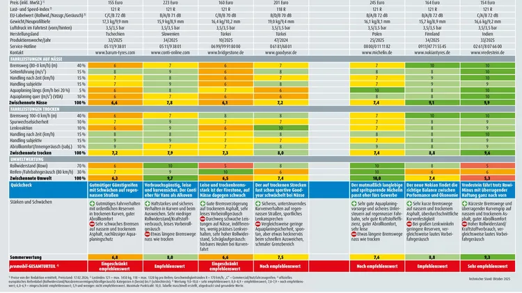 Gute Sommerreifen sollen auf nasser und trockener Straße sicher haften, hohe Laufleistungen erzielen und den Verbrauch senken. Zehn aktuelle Allround-Profile stellen sich unserer harten Testprozedur – welche können überzeugen?
