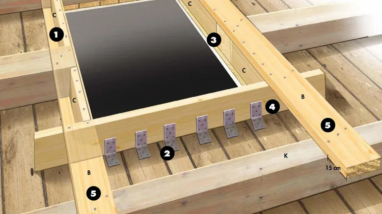 Um in der Deckenkonstruktion Platz für das neue Element zu schaffen, muss hier ein Teil eines vorhandenen Dachbalkens entfernt und durch Wechsel ersetzt werden.