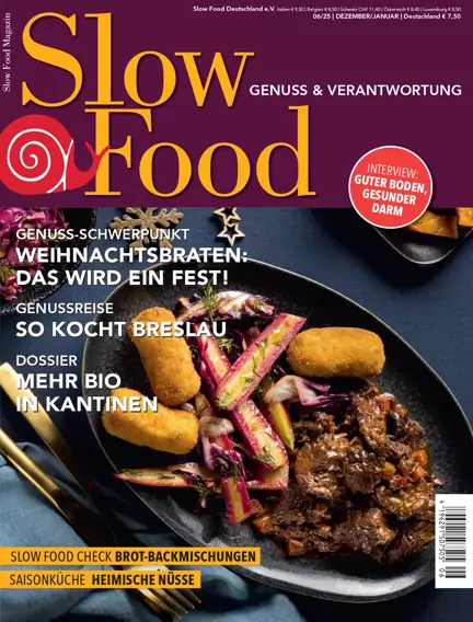 Das Slow Food Magazin verbindet hintergründig und unterhaltsam die Themen Kulinarik, Geschmack, Kultur, Gesellschaft und Verantwortung. Es wird gemacht von und für Menschen, die bewusst genießen und diesen Genuss mit anderen Menschen teilen wollen. Für alle, denen nicht egal ist, was sie essen! Das Slow Food Magazin ist regional, saisonal & köstlich: Reise- und Gastrotipps für Genießer, Weinverkostungen, Porträts alter Gemüsesorten und seltener Nutztierrassen, Lebensmittel im Slow-Food-Check und innovative Rezepte meinungsstark & aktuell: Dossiers zu Lebensmitteln & Ernährung, klare Positionen zu politisch und gesellschaftlich relevanten Themen wie Tierhaltung, Lebensmittelindustrie und Freihandel, Informationen über die Arbeit von Slow Food Deutschland