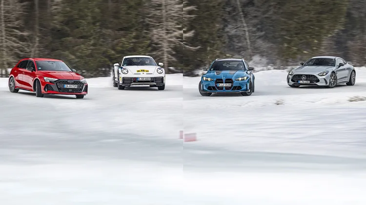 DIE ÜBERSCHRIFT IST KEINE PLATTITÜDE, SONDERN ALS PRÄDIKAT FÜR AUDI RS 3 SPORTBACK, PORSCHE 911 DAKAR, BMW M3 CS TOURING UND MERCEDES-AMG GT 63 S COUPÉ ZU VERSTEHEN, DIE IHRE POWER ÜBER GEWIEFTE ALLRADSYSTEME ZU EINEM HERRLICHEN MIX AUS SPORT UND SPASS VERSTRICKEN. WEIL MIR WUI’N QUEEEEEERFOAN!