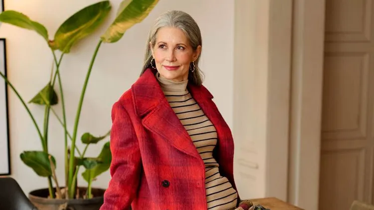 Mehr ist manchmal mehr: Starke Nuancen, mutige Kombinationen und fröhliche Muster bringen Karin und ihr tolles graues Haar jetzt zum Strahlen