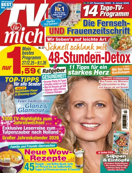 TV FÜR MICH ist eine Kombination aus 14-tägiger serviceorientierter Frauenzeitschrift und TV-Programm. Mit Mode, Beauty, Stars, Ratgeberteil, Gesundheit und einem 14-tägigen TV-Programm bietet sie die beste Mischung aus Beratung und Service.