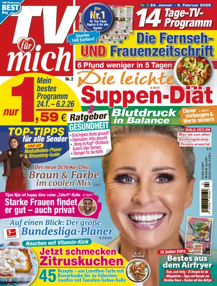 TV FÜR MICH ist eine Kombination aus 14-tägiger serviceorientierter Frauenzeitschrift und TV-Programm. Mit Mode, Beauty, Stars, Ratgeberteil, Gesundheit und einem 14-tägigen TV-Programm bietet sie die beste Mischung aus Beratung und Service.