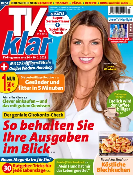 Übersichtlich, kompakt, klar: Die günstige Programmzeitschrift TV klar ist die wöchentliche, preisgünstige Fernsehillustrierte mit dem breiten Themenspektrum. Im Abo sichern Sie sich mit dieser Zeitschrift jederzeit das aktuelle Programm zu einem günstigen Preis! Das Abo dieser günstigen Fernseh-Illustrierten bietet Ihnen nicht nur einen übersichtlichen Programmteil inklusive Tages-Tipp und Wochenplaner. TV klar steht zudem Woche für Woche für beste Unterhaltung und einen starken Service: Rätsel, Verbraucher-Tipps und viele Ratgeber rund um die Themen Gesundheit, Geld, Partnerschaft und Familie. Für Fernseh-Fans, die sich auf eine übersichtliche Programmplanung konzentrieren möchten Inhalt: TV Programmplanung, eine breite und bunte Mischung aus Reportagen, Geschichten, Gewinnrätseln und Ratgeberseiten