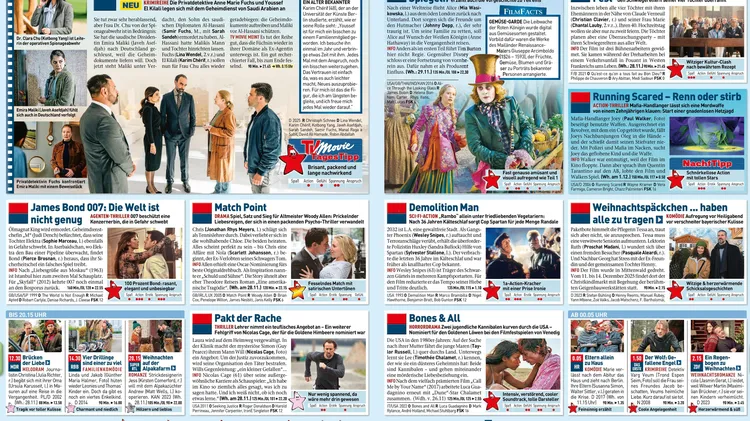 TV-Highlights, Hollywood Stars, Sport-News und Multimedia-Trends – das ist die Welt von TV Movie, die alle 14 Tage neu erscheint. Für Durchblick im TV-Programm sorgen: der Movie-Star, der alle Spielfilme nach ausgewählten Kriterien zuverlässig bewertet, Europas härteste Filmredaktion, eine sechs Seiten Senderübersicht, die Spartentipps, der 14-Tage-Top-Check sowie die Höhepunkte der Programmwoche. Abgerundet wird das Angebot durch kompetente Kinotipps und exklusive Berichte zu aktuellen TV-Sendungen. Für Fernsehfans, die einen großen Überblick über alle Programme brauchen und auf Neuigkeiten aus der Filmbranche nicht verzichten wollen. Mit TV Movie sind Sie nie mehr im falschen Film.