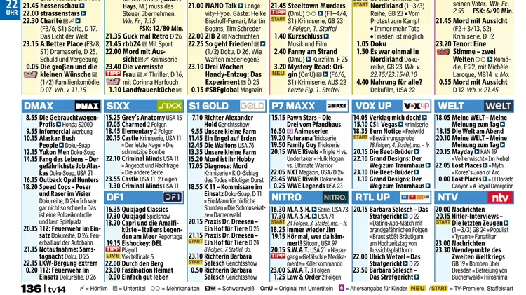 tv14 ist das TV-Magazin, das die Themenvielfalt einer Wochenzeitschrift mit der Übersichtlichkeit eines zweiwöchigen Fernsehprogramms verbindet.