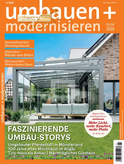 Themen in dieser Ausgabe: Energiesparende und klimaneutrale Häuser, Wärmepumpen, Bauen mit Holz, Wintergarten und Glashaus, Smarthome-Sicherheit, Beschattungen, vorgeplante Häuser und Aktionshäuser sowie Hausvorstellungen und Bauherren-Storys. Unser Haus für die ganze Familie zeigt alle Möglichkeiten des preiswerten Bauens - von schlüsselfertigen Häusern über Ausbauhäuser bis hin zu Selbstbauprojekten. Reportagen über Bauvorhaben junger Familien geben Anregungen und machen Mut. Sämtlichen Möglichkeiten, Eigenleistungen einzubringen, wird ausführlich in detaillierten Schritt-für-Schritt-Anleitungen Rechnung getragen. Zahlreiche Praxis-Tipps und Ratschläge von Fachleuten zu den Themen Planung, Grundstück, Baurecht und Finanzierung helfen noch mehr Geld zu sparen und schützen vor Fehlern. Regelmäßig große Marktübersichten zu allen wichtigen Baubereichen mit Preisbeispielen und Einkaufstipps - alles zugeschnitten auf den kleinen Geldbeutel. Immer aktuell: Neue Produkte, Herstellerinformationen, Gewinnspiele.